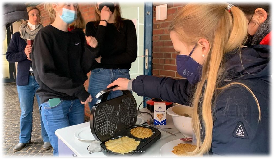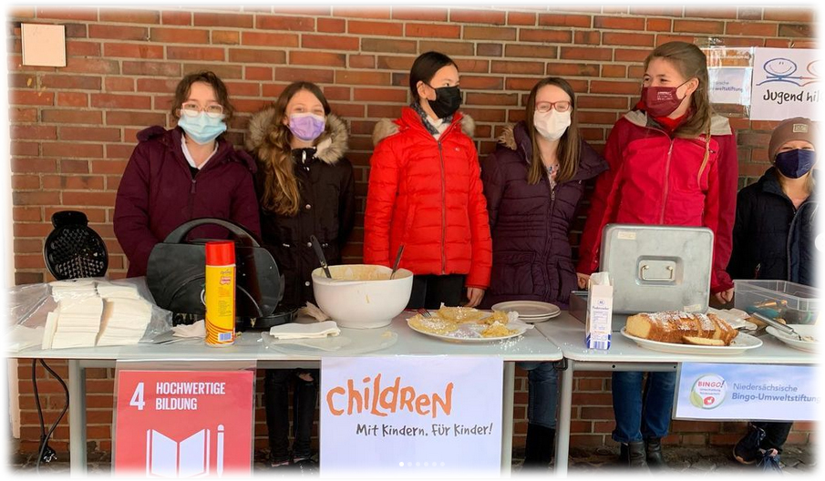 Wie wir von Oldenburg aus unterstützen… Alle helfen mit! Waffelverkauf in der Pause Endlich wieder Veranstaltungen am NGO ..schon wieder eine Schüssel leer mmmh, lecker…